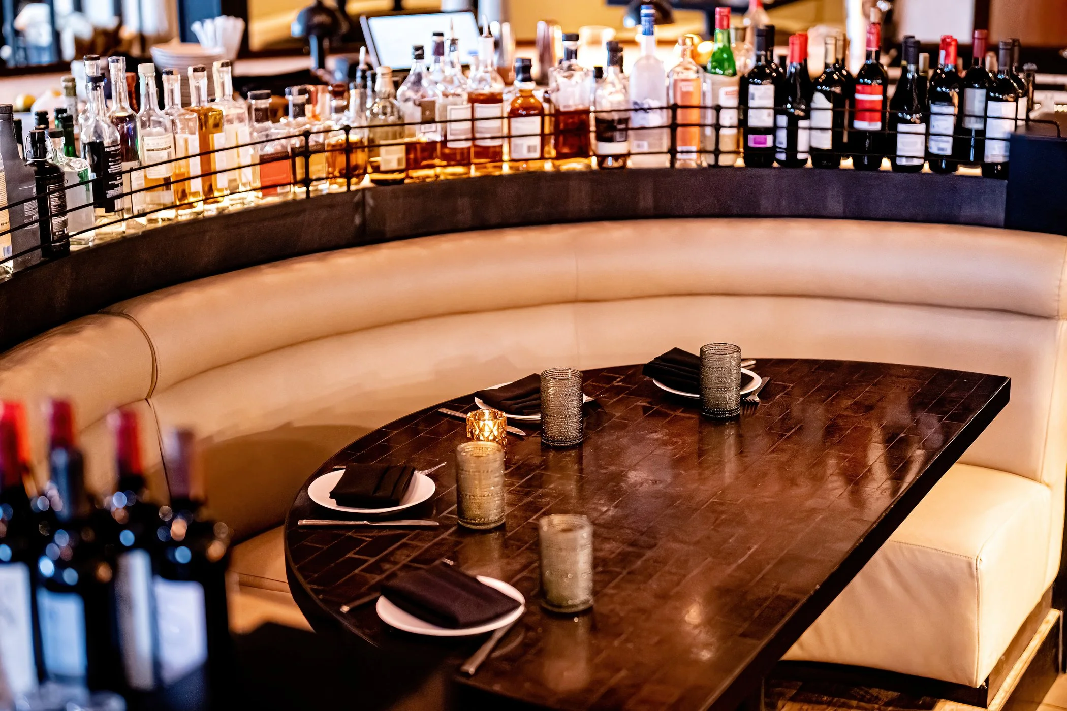 dLeña’s chef’s table is tucked behind the main bar with an exquisite leather banquette facing directly into the open kitchen.